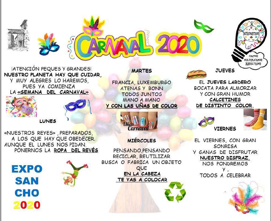 Este año con motivo de la Expo Sancho 2020 de diferentes países nos vamos a disfrazar. Cuidando el medio ambiente , con material reciclado, bonitos disfraces vamos a llevar.