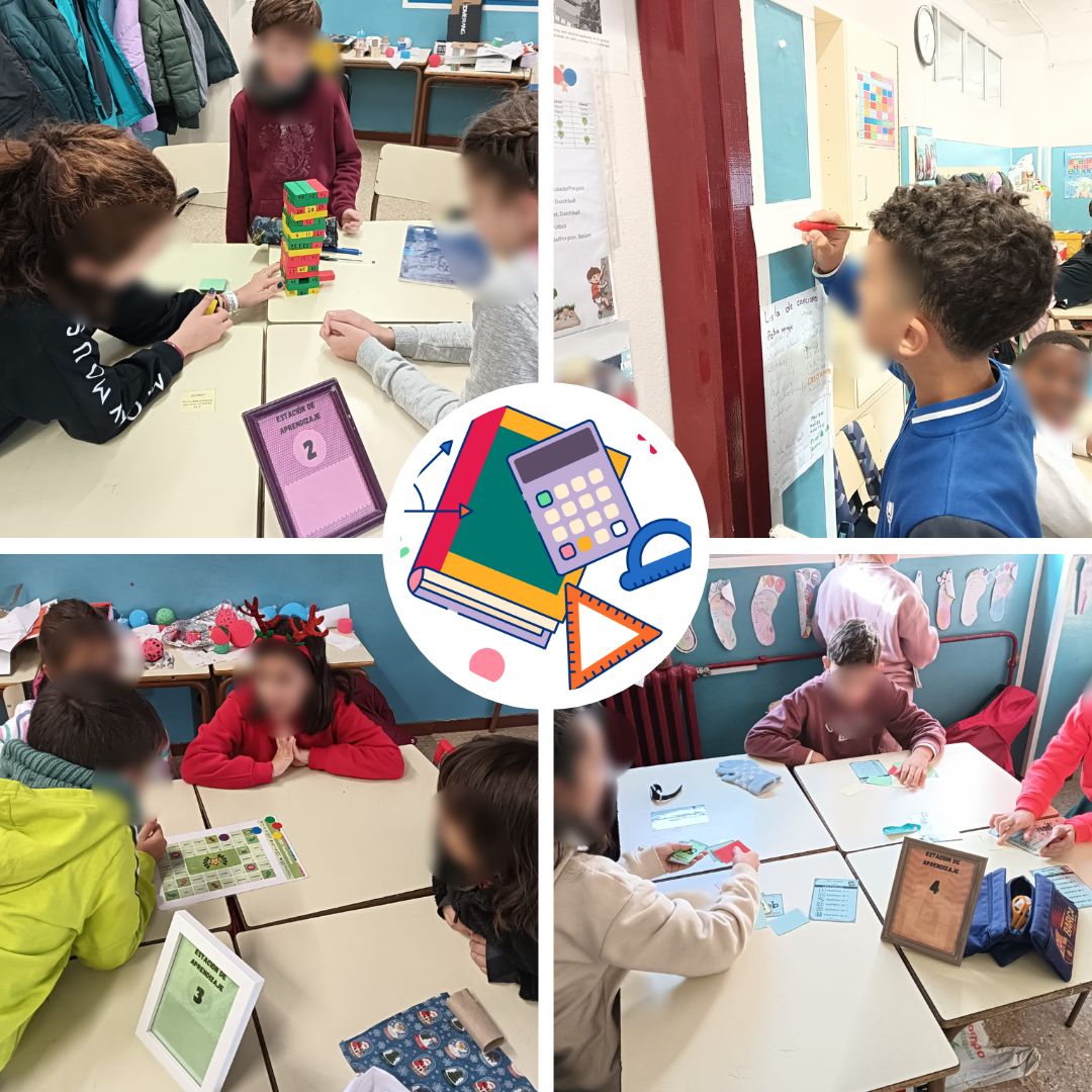 Las estaciones de aprendizaje son diferentes espacios en los que el alumnado realiza diferentes actividades de manera independiente o en pequeños grupos. Cada estación tiene un objetivo específico y una tarea asignada, lo que permite una rotación fluida y un aprendizaje más dinámico. En quinto, se trabajan algunas sesiones de matemáticas a través de esta metodología, alternando juegos matemáticos cuyo objetivo es el aprendizaje de algunos conceptos matemáticos de una manera lúdica.