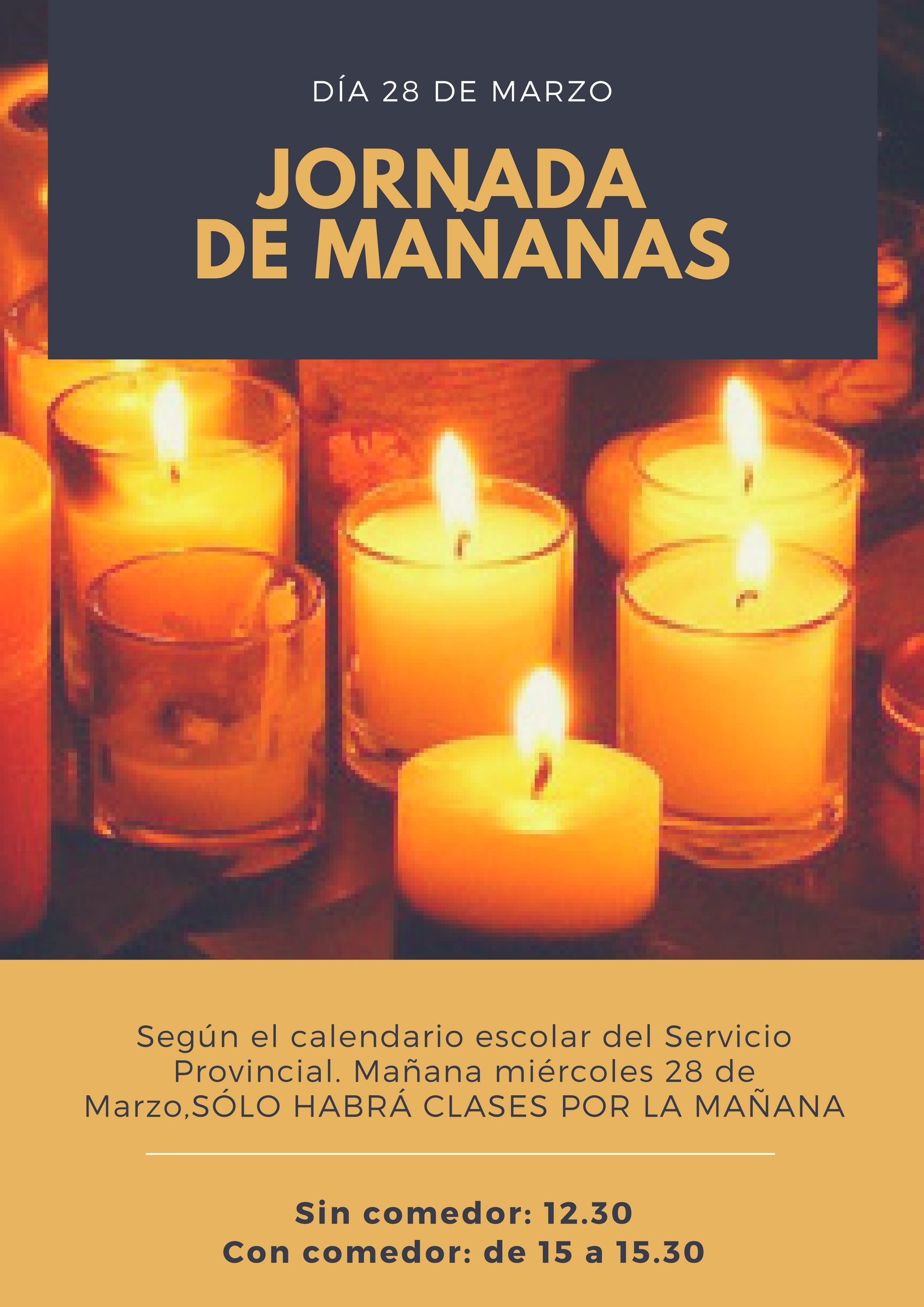Según marca el Calendario Escolar del Servicio Provincial de Educación, mañana miércoles 28 de Marzo, sólo habrá jornada de mañanas en los centros educativos de Aragón, por lo que las salidas serán a las 12.30 para el alumnado que no se queda en el comedor y de 15 a 15.30 para el alumnado que hace uso del servicio de comedor.