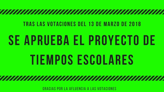 Ayer 13 de Marzo, se celebraron en nuestro colegio las votaciones para la aprobación del Proyecto de Tiempos Escolares. Tras el escrutinio, éstos son los resultados obtenidos: