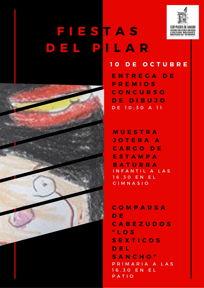 Este año en nuestras fiestas del Pilar, hemos disfrutado muchísimo. Los compañeros/as de Sexto nos han deleitado a grandes y pequeños con su Comparsa de Cabezudos: "Los Sexticos del Sancho". Los alumnos/as de Estampa Baturra, vinieron a bailarnos unas jotas y a enseñarles sus trajes regionales a todos el alumnado de Infantil y los compañeros/as de Primaria se divirtieron mientras les encorrían los cabezudos.