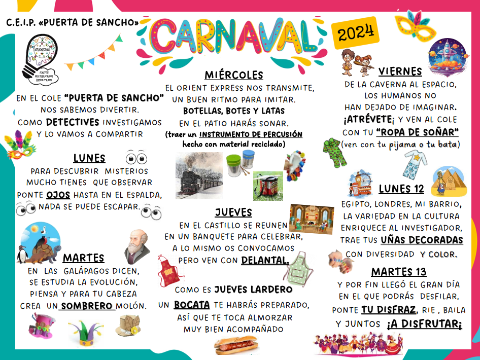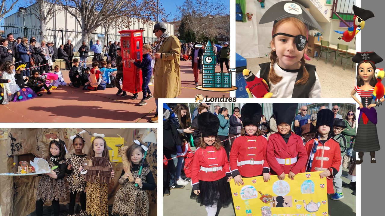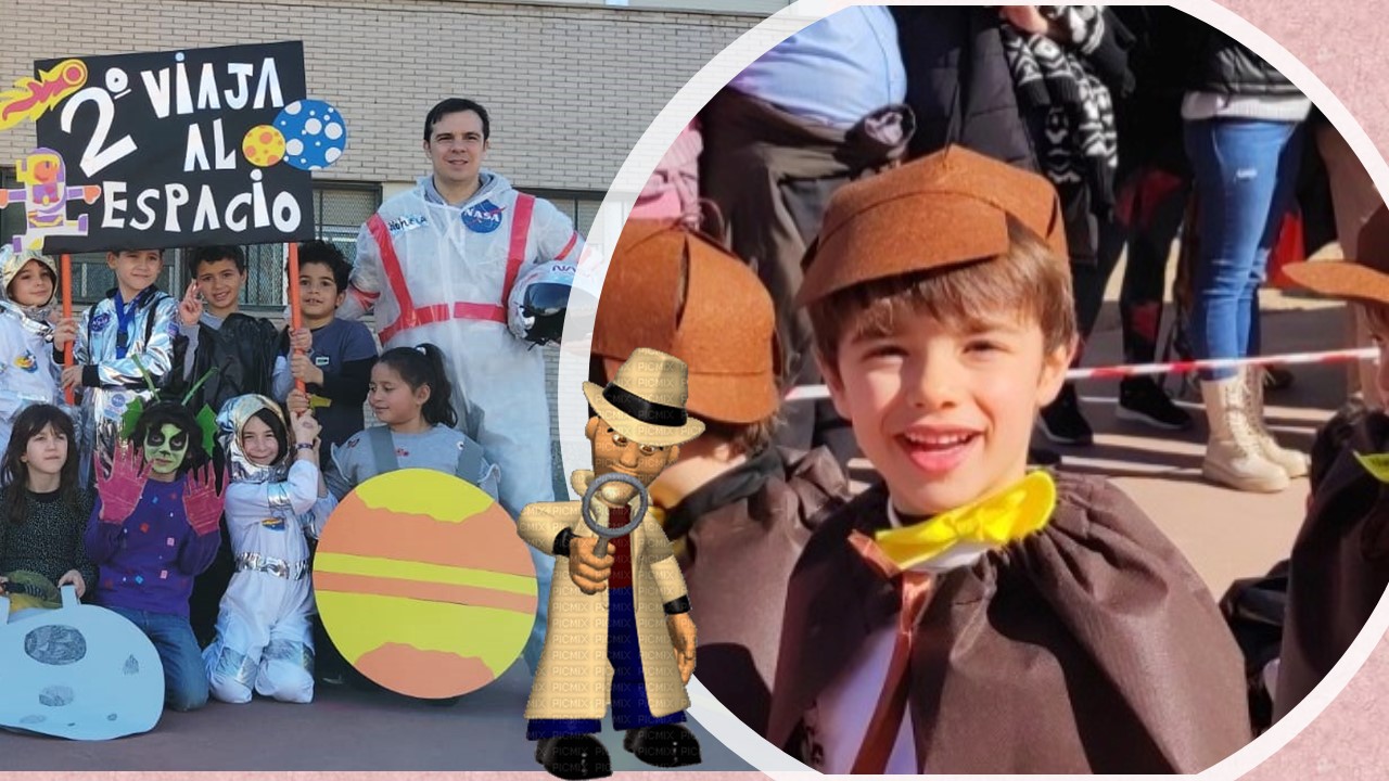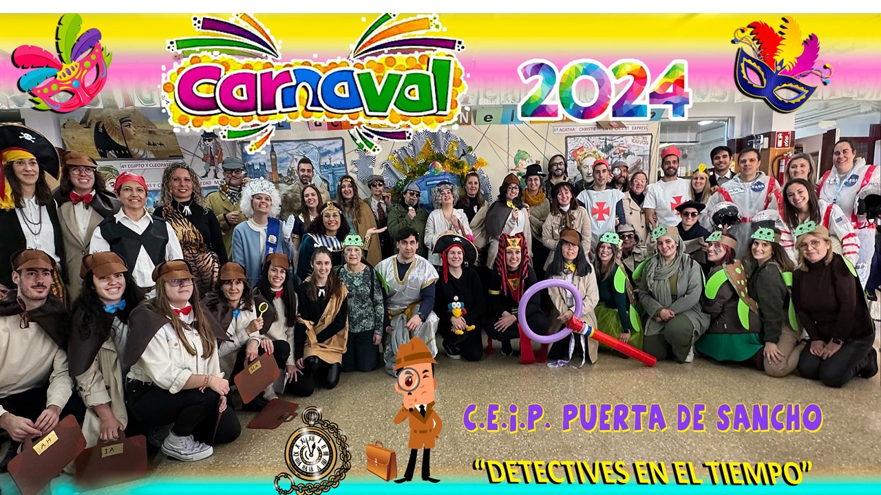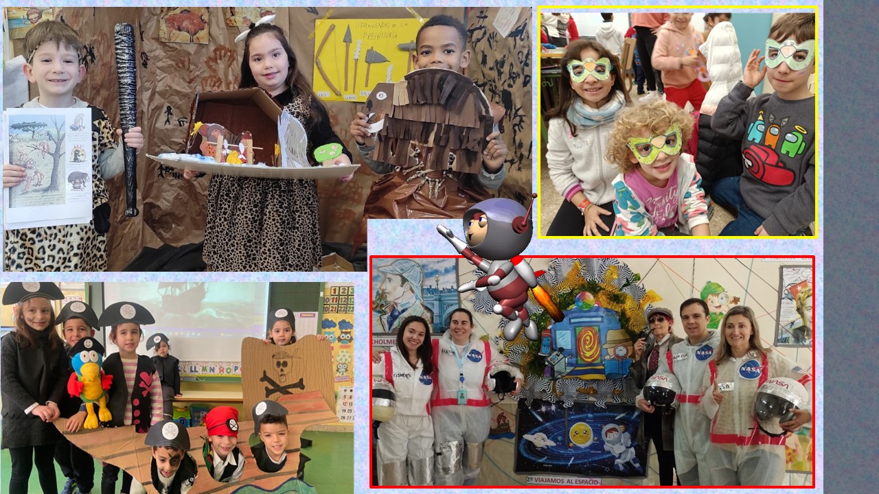 Como todos los años nuestro Carnaval ha tenido como centro de interés la temática de nuestro Plan de Innovación, por ello, hemos sido "DETECTIVES EN EL TIEMPO" y hemos volcado parte de los aprendizajes que hemos ido adquiriendo, en nuestras vestimentas y accesorios: tortuga gigante de las Galápagos, piratas, detectives, caballeros medievales, egipcios y egipcias, habitantes prehistóricos, viajeros en el espacio, ciudadanos de la época del Orient Express, ..