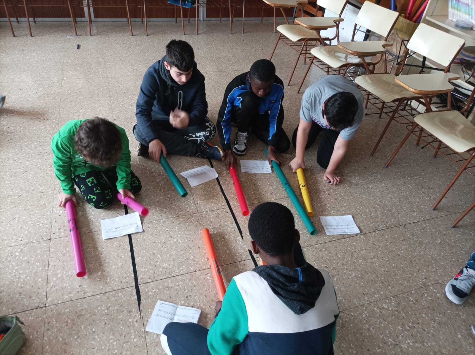 En nuestras clases de música, hemos estado haciendo ejercicios de coordinación instrumental mediante Boomwhakers, a través de una adaptación de